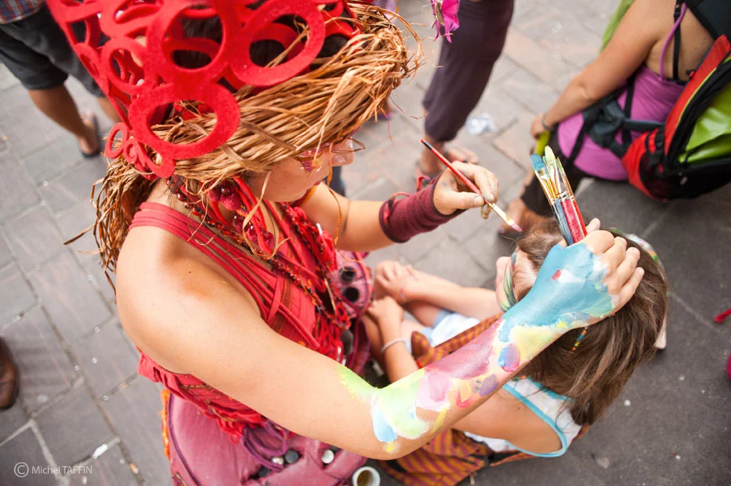 Maquillage en déambulation dans le cadre de Faites Lire ! et de la "Rue du Livre". Dimanche 6 octobre, déambulations de 13h30 à 15h et de 16h30 à 18h. Les Peintres Nomades, personnages hauts en couleurs, déambulent parmi la foule. Sur leurs hanches, se balancent les couleurs du monde. 2, 3, 4, 6, 8 !... Plus elles sont, plus l’effet visuel enchante ! On les croirait venues des quatre coins du monde avec leurs costumes de rouge camaïeux, leur mélange de matières, étoffes, dentelles, grelots et grigris récoltés au gré des rencontres lors de leurs multiples voyages. Les regarder passer, c’est... étonnant... très doux... un peu comme une petite brise qui fait du bien aux yeux et au moral. Puis au détour d’une rue, elles croisent votre regard !!! ...Elles vont sûrement dégainer leurs pinceaux !!! Et c’est vous que l’une d’elle a choisi ! En un geste vif et habile, elles posent une note... ou 2... juste ce qu’il faut... Rencontre insolite, intimiste, fugace ... Rencontre touchante du bout d’un pinceau.